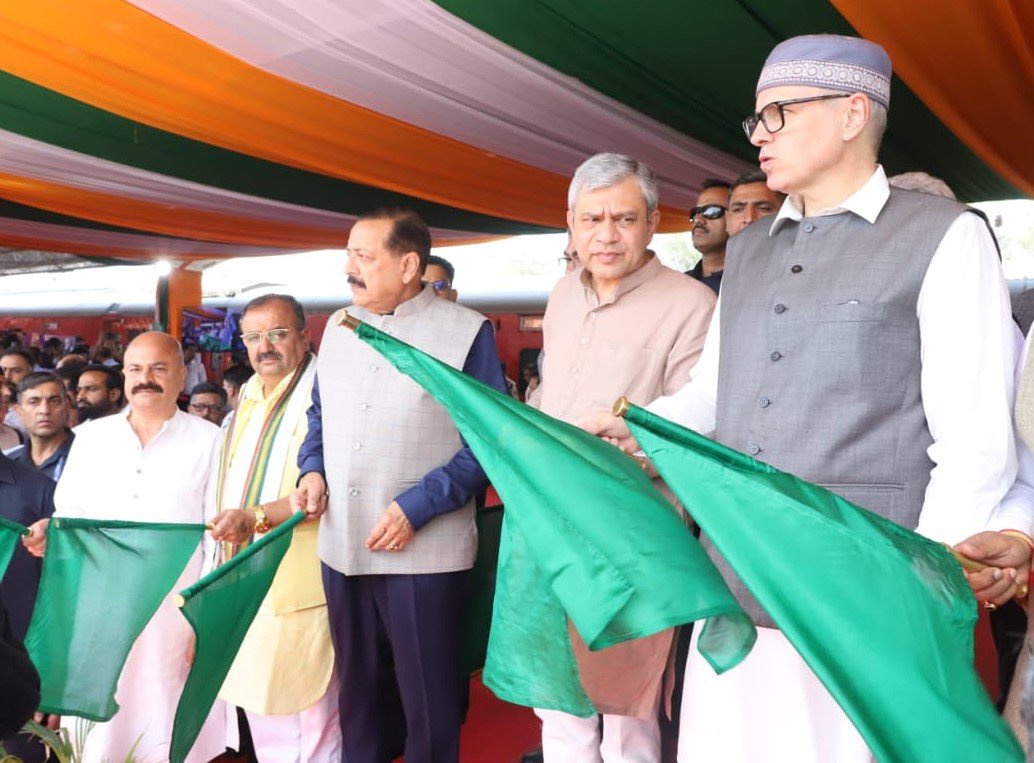 —रेल मंत्री अश्विनी वैष्णव, केंद्रीय राज्यमंत्री डॉ. जितेंद्र सिंह और मुख्यमंत्री उमर अब्दुल्ला ने हरी झंडी दिखाई